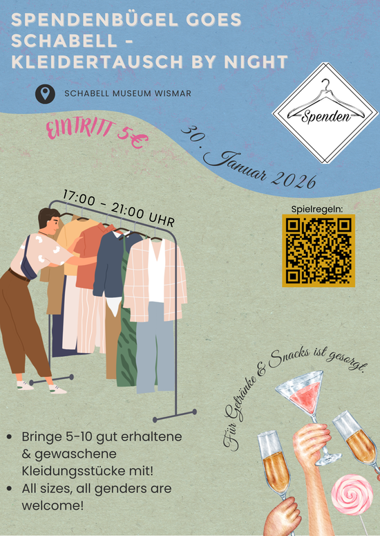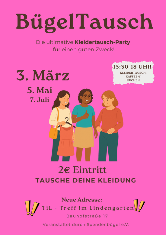 Bringe deine aussortierten Lieblingsstücke mit und finde neue Schätze im Kleiderschrank anderer! Gemeinsam tauschen statt kaufen – für mehr Nachhaltigkeit, Gemeinschaft und einen guten Zweck. Kleidung, die keinen neuen Besitzer findet, kommt unserem Verein zugute. Komm vorbei, tausch dich aus und tu dabei etwas Gutes!